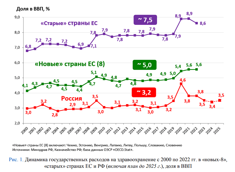 Россия стабильно отстает как от «старых», так и от «новых» стран-участниц ЕС в пропорциональных ВВП объемах государственных инвестиций в здравоохранение