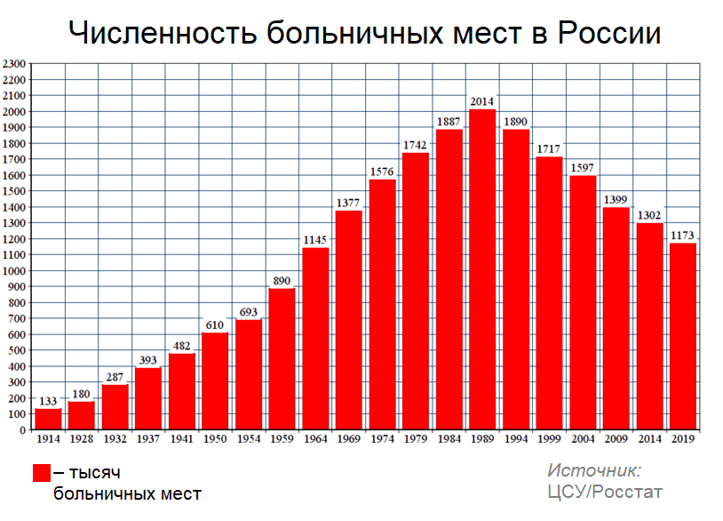 Тем не менее, стоит признать, что показатели вроде количества врачей и коек на человека в России действительно высокие по сравнению со средними по миру. Только вот это эффект высокой базы, оставшейся в наследие от Советского Союза и эти показатели стремительно сокращаются из-за последствий реформ «оптимизации», начатых ещё в 2010-е годы.