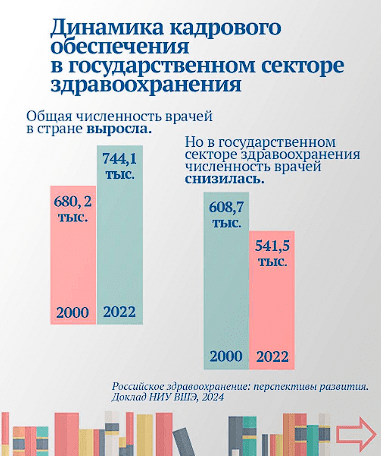 Количество коек было сокращено более чем на 300 000 в 2019 году по сравнению с 1999. И хоть общее число врачей в стране и выросло, во многом это связано с развитием частного сектора и бьюти-медицины, недоступных большинству россиян. Число врачей в государственных клиниках неустанно уменьшается: от 608 тысяч в 2000 году до 541 тысячи специалистов в 2022. Ситуация с средним медицинским персоналом (медсестры, фельдшеры) еще более удручающая: по данным Верстка.медиа, количество специалистов этого профиля достигло абсолютного минимума с 1960-х годов из-за тяжелых условий труда и низких зарплат.