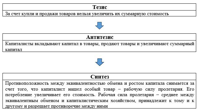 Этот алгоритм диалектического мышления Ильенков иллюстрирует на примере из «Капитала» Карла Маркса. Маркс, изучая капиталистическое товарное хозяйство, обратил внимание на одно из главных его противоречий. С одной стороны, рыночный обмен есть обмен эквивалентов, равных стоимостей и за счет него нельзя увеличить суммарный капитал. Владелец денег покупает у товаровладельца товар на 5 рублей, а продает его за 6. Пусть он выручил 1 рубль, но общая сумма как равнялась 11 рублям, так и теперь равняется. Она не изменилась, не превратилась в 25 рублей. Однако в случае капиталистического хозяйства общая сумма возрастает, ведь капитал мы так и определяем – как самовозрастающую стоимость. Как это возможно? Ответ Маркса прост: капиталист нашел такой вид товара, потребление которого не уменьшает, а увеличивает его стоимость (именно стоимость, а не спекулятивную надбавку к цене). Это – рабочая сила пролетария. Капиталист купил ее за 5 рублей, потребил (то есть использовал по назначению – заставил работать на своем предприятии) и она принесла ему еще 20 рублей (стоимость товаров, которые произвел рабочий, и которые присвоил капиталист как владелец средств производства). Рабочая сила и есть «средний член», который соединяет противоположности (эквивалентный обмен и возрастающий капитал) и помогает разрешить противоречие между ними.