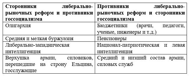 Таково было российское общество первого постсоветского десятилетия – пресловутых 1990-х. Оно было расколото на тех, кто был против реформ, которые вело правительство Гайдара-Ельцина и тех, кто был за эти реформы. Иными словами, на тех, кто желал вернуть советскую действительность, где все были своеобразными служащими государства (не только чиновники – работники государственного аппарата и «силовики», но все – вплоть до дворников) и тех, кто бросился в стихию рынка, разрешенного реформаторами, и надеялся обрести там богатство и влияние. Итак, в одном лагере были сторонники Гайдара и Ельцина – появившиеся олигархи, бизнесмены средней руки, мелкая буржуазия, а также прозападно и либерально настроенные представители культуры, «либеральная интеллигенция» и небольшая, поддержавшая реформы прослойка «силовиков», получившая за предательство СССР солидные материальные блага. Они хотели развития рынка и капитализма, союза с Западом, сведения государства к минимуму, к роли «ночного сторожа», лишь охраняющего собственность, чтобы оно не мешало им проворачивать сделки и писать, и говорить, что им хочется в разнообразных «свободных СМИ». В другом, противоположном лагере была основная часть «силовиков» (офицеры среднего и низшего уровней, рядовой состав), большинство госслужащих, бюджетники, пенсионеры, работники ВПК, наукоемких областей, образования, медицины. Они выступали за укрепление государства, за воссоздание его социальных функций, против союза с Западом, за автаркию страны, ее самостоятельный путь развития. В этом состояла суть столкновения между «либералами-западниками» и «советскими патриотами» 90-х. Это было столкновение тех, кто жил на доходы от рыночных операций, народившейся буржуазии (и ее идеологической «обслуги»), и тех, кто жил и хотел дальше жить на жалование, зарплату, выплаты от государства (нетитульных, неофициальных госслужащих, «бюджетников»). Выразим его при помощи схемы.