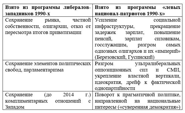 В итоге власть была просто вынуждена пойти на компромисс. В экономическом смысле он состоял в том, что часть средств, получаемых от продажи нефти, газа и металлов за рубеж, стали давать на подержание бюджетников, на укрепление государства, армии, силовых служб, социальной инфраструктуры. В идеологическом и политическом смыслах это означало частичное принятие требований «лево-патриотической оппозиции», частичную приостановку либеральных реформ, но с сохранением их основных «достижений». То есть новое правительство (а потом и новая администрация), политику которых воплощала фигура сперва премьера, а потом и президента В.В. Путина, пришло к некоей «середине» между программами «либералов-западников» и «левых национал-патриотов». В России сохранился рынок, буржуазия, олигархи, но вернулись идеократия, патриотическая идеология, фактическая однопартийность, сильное государство. Проще говоря, кое-что было взято из программы Гайдара-Чубайса, кое-что – из программы Зюганова-Проханова, но так, чтоб сохранить интересы и капиталы «прорабов» перестройки и приватизации, ядра буржуазии, сформировавшейся в 1990-х.